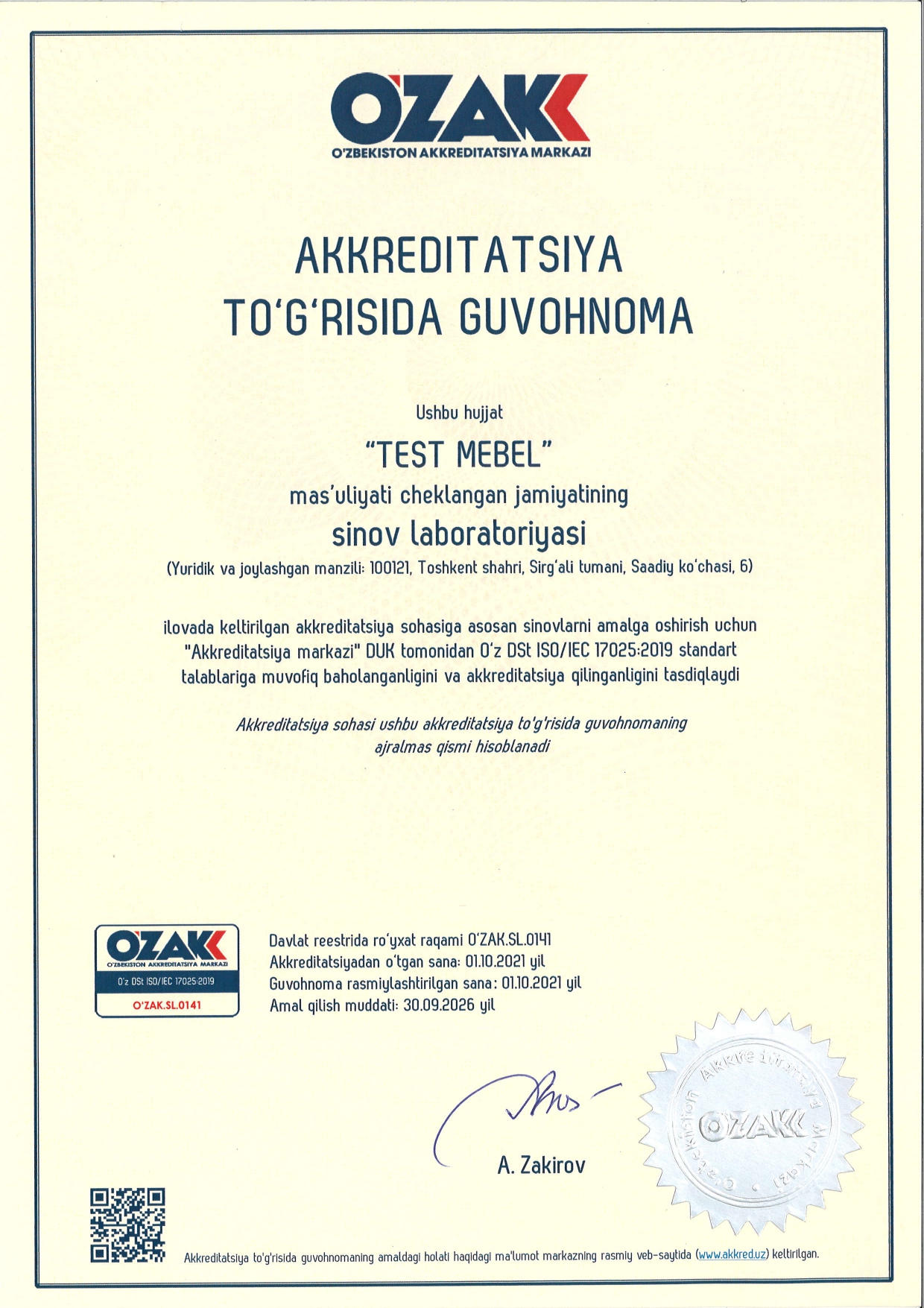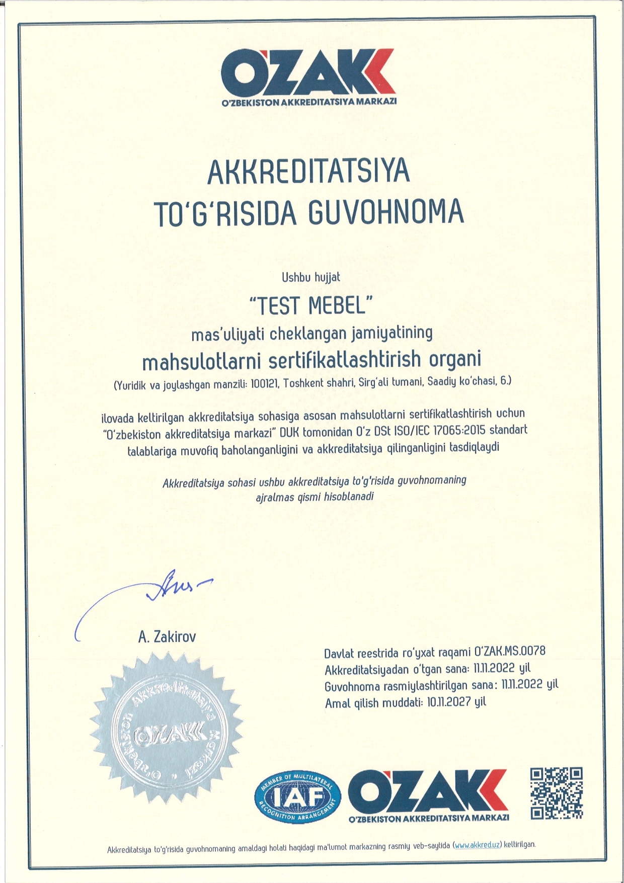 ООО «TEST MEBEL» - является органом по сертификации мебельной и деревообрабатывающей продукции.